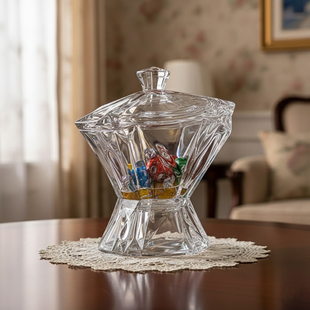 Sticla cristalina transparenta pune in valoare continutul, iar forma moderna, specifica colectiei Enigma, aduce un plus de stil mesei sau vitrinei. Este un recipient versatil, creat pentru dulciuri, snacks-uri fine sau mici obiecte pe care vrei sa le pastrezi la vedere intr-un mod elegant.