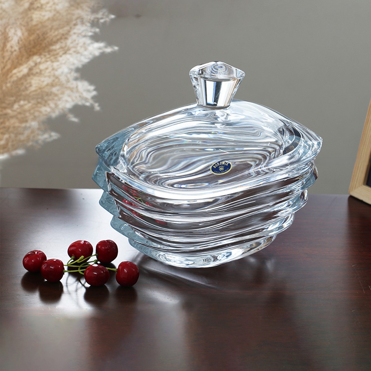 Aceasta bomboniera Bohemia este realizata din sticla de inalta calitate, parte din colectia Wave, cunoscuta pentru designul sau modern si textura optica distinctiva ce aminteste de valurile marii.