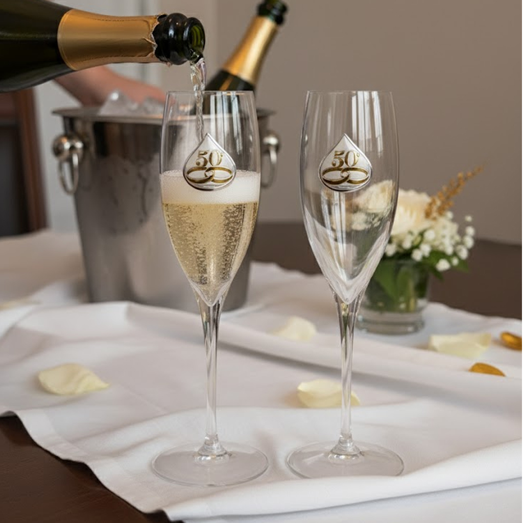 Cauti un cadou elegant si simbolic pentru o nunta de aur? Paharele de sampanie cu inscriptie in forma de inima si cifra 50 sunt alegerea ideala pentru a sarbatori 50 de ani de iubire si fericire alaturi de persoana iubita. Aceste pahare din sticla premium, cu detalii argintate, aduc un plus de rafinament oricarei ocazii.