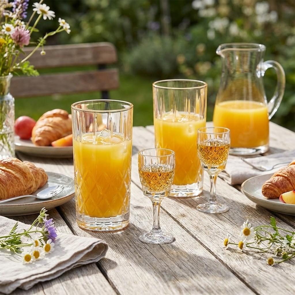 Paharele de 320 ml sunt ideale pentru apa, limonada, suc sau bauturi racoritoare, avand o capacitate echilibrata si o forma comoda pentru servire. Paharele de aperitiv de 60 ml completeaza setul cu o varianta potrivita pentru lichior, tuica, palinca sau shot-uri servite elegant, fiind detaliul care aduce un plus de stil atunci cand ai invitati.