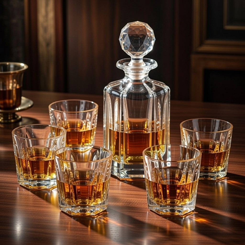 Setul include 12 pahare whisky de 250 ml si o sticla din cristal de 800 ml, potrivite pentru whisky, bourbon sau cocktailuri scurte.