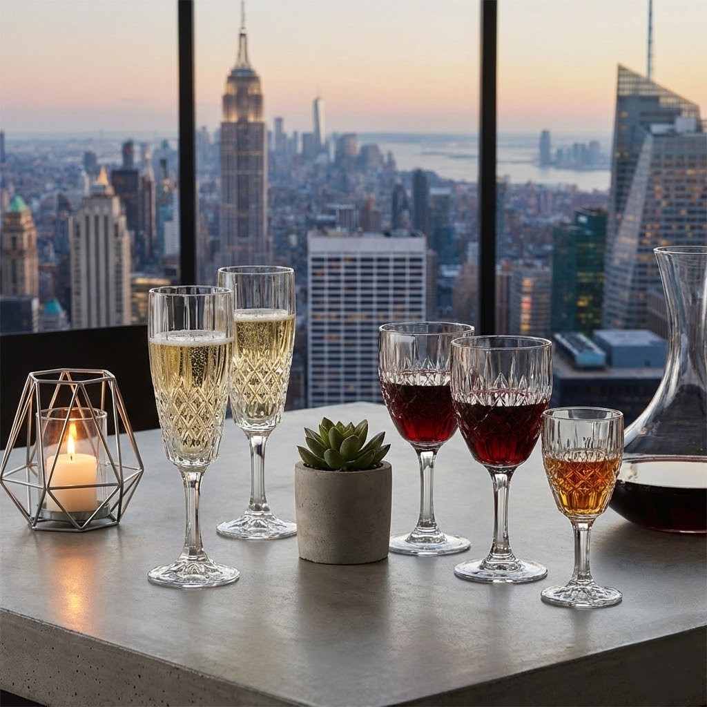 Paharele de sampanie de 160 ml sunt ideale pentru sampanie, prosecco si vinuri spumante, fiind perfecte pentru toasturi si ocazii speciale. Paharele de vin de 170 ml sunt potrivite pentru vin alb, rose sau vin rosu servit in portii echilibrate, mai ales la cine si degustari. Setul este completat de paharele de aperitiv de 60 ml, excelente pentru lichior, tuica sau palinca, atunci cand vrei o prezentare eleganta si un set unitar pe masa.