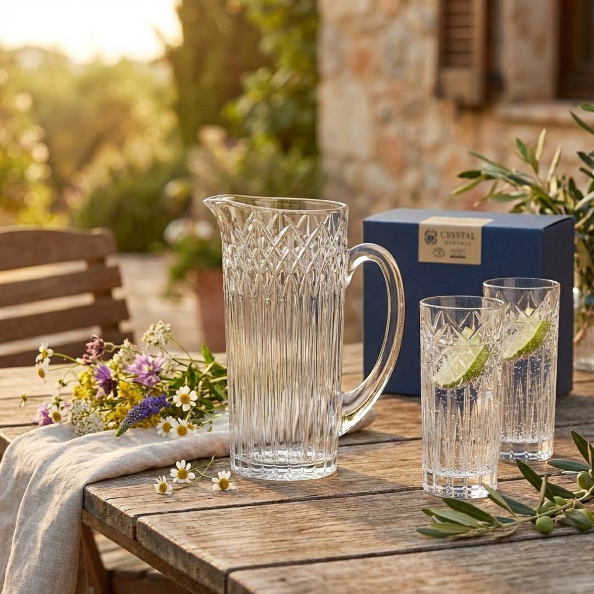 Setul include 6 pahare de apa de 330 ml si o carafa cu capacitatea de 1150 ml, realizate din sticla cristalina Bohemia, cu claritate buna si finisaj atent.