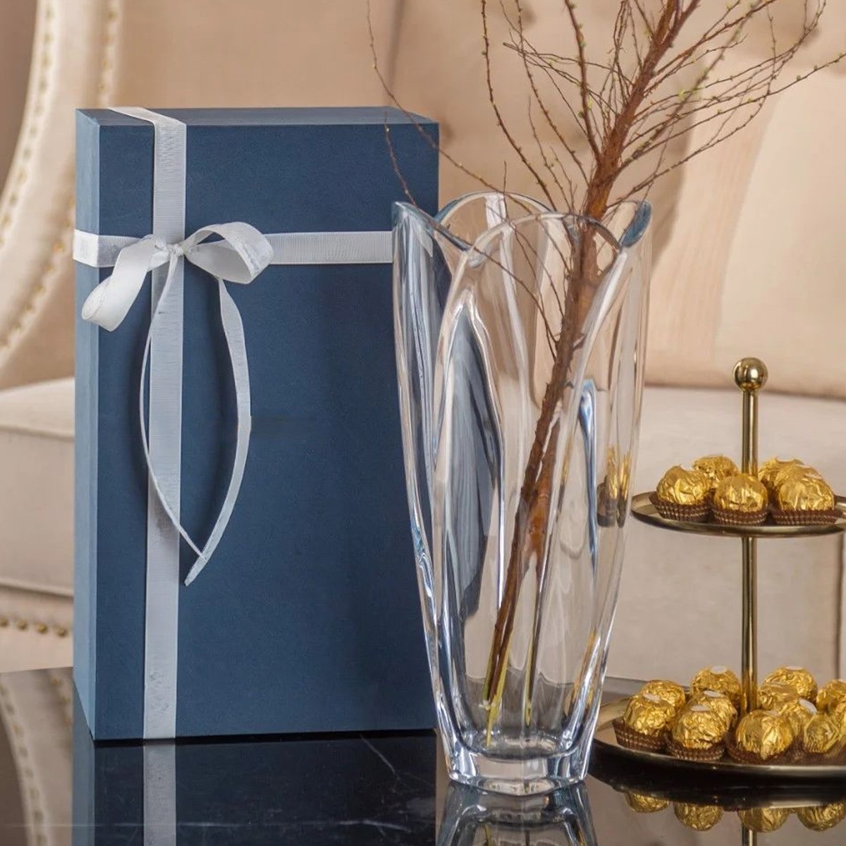 Vaza Bohemia este ambalata intr-o cutie tip cadou, ce poate fi daruita ca atare.